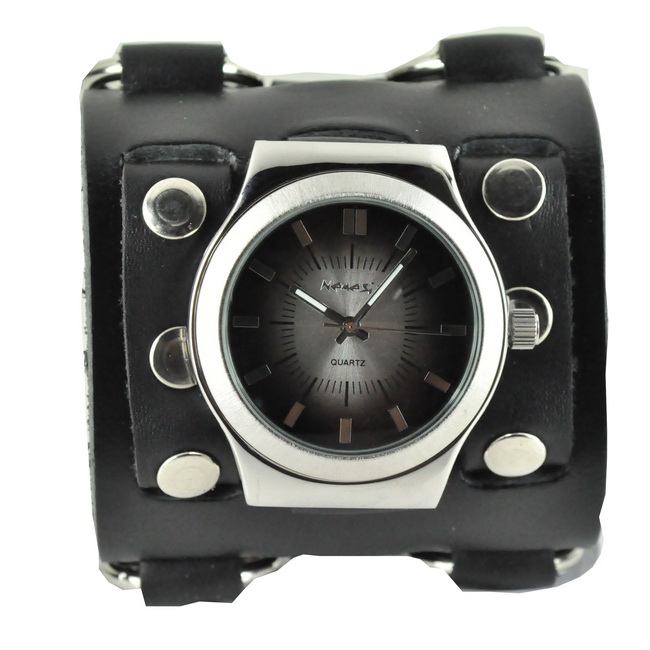 A silver and black gradient dial sits in the polished alloy case of this casual watch from Nemesis. A wide black leather strap with silvertone rings and studs finishes the bold style of this timepiece.